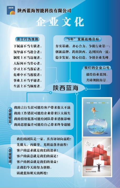 隨著公司規(guī)模的增大、員工數(shù)量的增多,近日公司對(duì)企業(yè)文化進(jìn)行更新。此次企業(yè)文化強(qiáng)調(diào)個(gè)人素質(zhì)的提升,從細(xì)節(jié)著手,具備憂患意識(shí),上下同心,相互監(jiān)督,真正將藍(lán)海的企業(yè)文化融入日常生活中,全面提升藍(lán)海同仁綜合素質(zhì)。